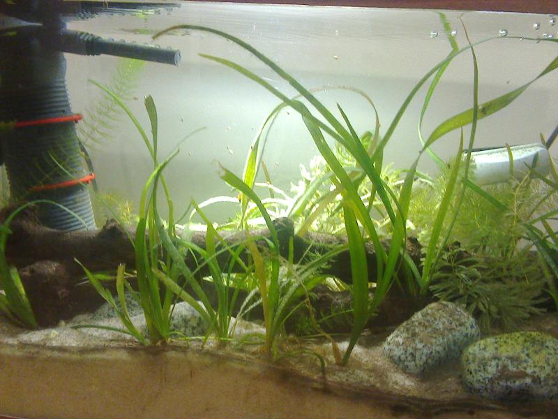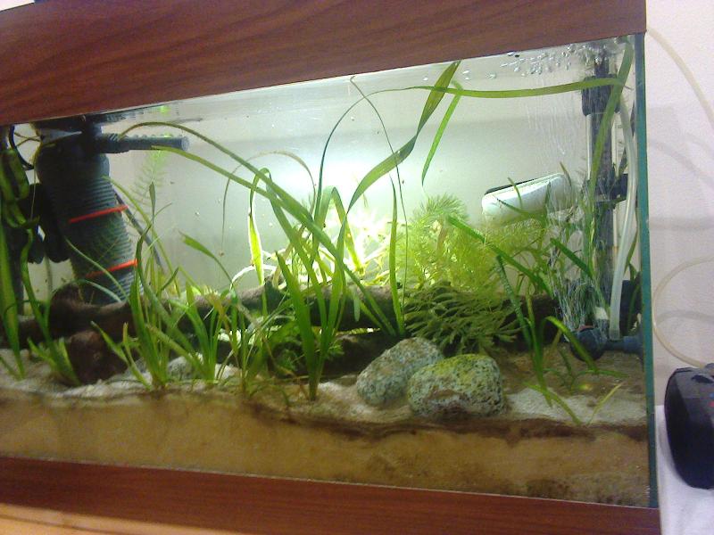 Δεν έχει ψάρια μέσα μόνο λαθρεπιβάτες. Είναι 9 μήνες ενεργό. Είναι ενυδρείο 60 λίτρων. Φωτιμός 8ωρο (αυτόματος) από 1 τ8 800 lux και ένα προβολέα led 4500K 20W 1800 lux. |