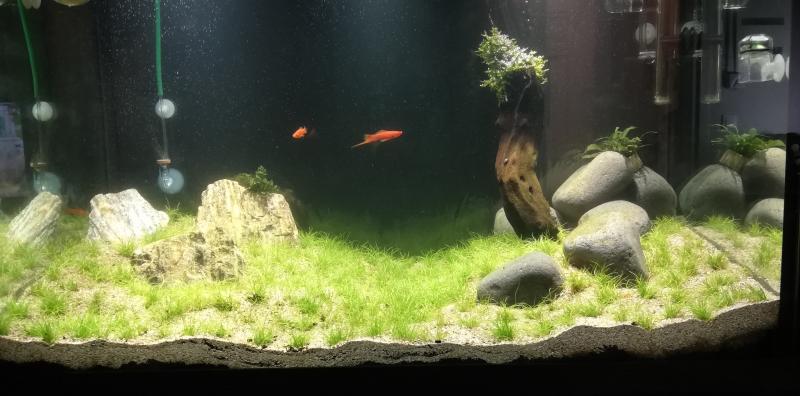 Στα τζαμια βγαινει η αλγη και στις πετρες,στα φυτα οχι. Πιστευω με την αυξηση της φυτομαζας (οπως μου ειπες και εσυ) θα ερθει η ισορροπια αλλα για την ωρα με τοι lockdown δεν μπορω να κανω κατι. Το aquascape ακομα δεν ειναι αυτο που εχω στο μυαλο μου,αλλα σιγα σιγα... Οι φωτο το αδικουν,τις εβγαλα με χαμηκη αναλυση γιατι αλλοιως δεν μου τις ανεβαζει. |