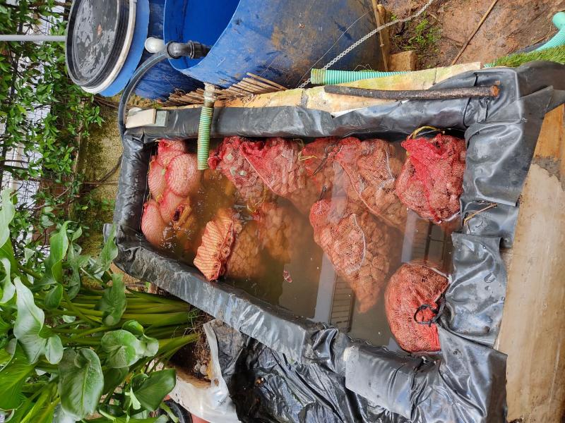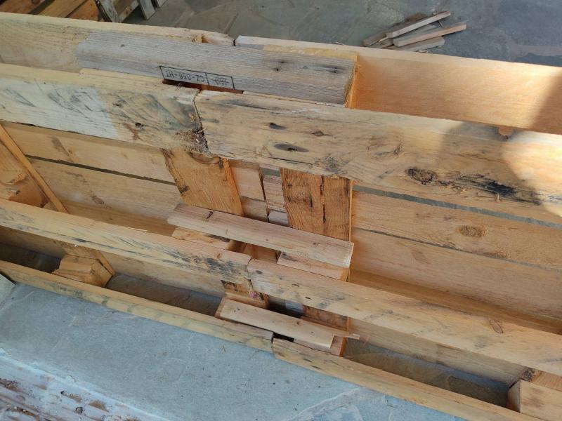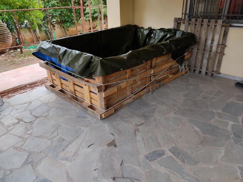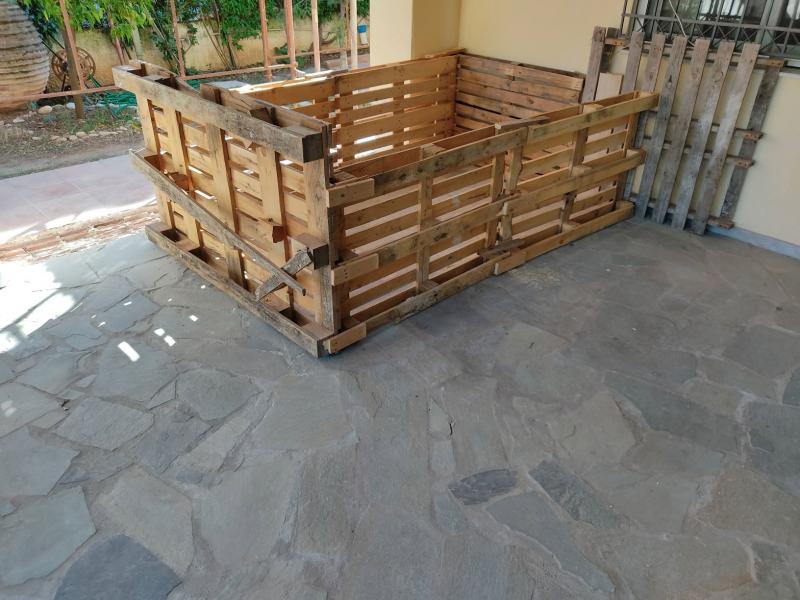 Το πρώτο βήμα είναι να φτιαχτεί ένας προσωρινός χώρος. Η παλετοδεξαμενή 1 κυβικό που έχω είναι πολύ καλή αλλά μικρή. Τα δικά μου είναι κτήνη και χρειάζονται περισσότερο χωρο. Έτσι χρησιμοποιώντας*ξύλινες παλέτες* έφτιαξα κάτι που θα κρατήσει μήνες. Τις παλέτες τις κάρωσα με πρόκες. Τις έδεσα με σύρμα. Ο πυθμένας*δέθηκε μεταξύ του με σχοινιά για να μην ανοίξει. Την πέρασα όλη άλλες 2 γύρους από ένα χοντρό σκοινί που είχα. Έβαλα και έναν μουσαμά.