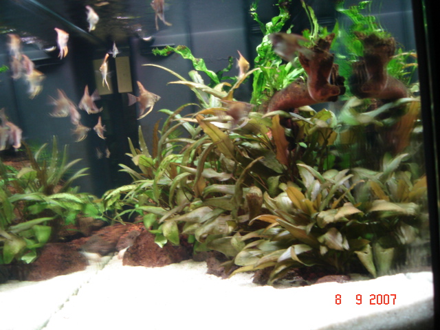 -------------------------------------------------------------------------------- Πληροφορίες Διαστάσεις:80 Χ 30 Χ 40 carrefour Όγκος:ονομαστικός όγκος 96 λίτρα Κατηγορία:παιδική χαρά Φυτά: microsorum pteropus,ceratophyllum demersum, cryptocoryne balansae, cryptocoryne wendtii brown, microsorium "ex Natura". Ψάρια / ¶λλα είδη: Pterophyllum scalare (περίπου 25 μικρά) 1 Corydoras aeneus albino Διακοσμητικά υλικά: ξύλα mopani, ελάχιστες πέτρες, σκούρο χαλίκι κατάλληλο για ενυδρειακή χρήση με ύψος περίπου 5-6 cm,άμμος λευκή ψιλή, υπόστρωμα sera floredepot κάτω από το χαλίκι Φόντο: μαύρο χαρτόνι Φωτισμός: 2 Χ 18W (arcadia original tropica, sylvania daylight) Διάρκεια φωτισμού: 10 ώρες, μέσω χρονοδιακόπτη Φιλτράρισμα: Το εργοστασιακό φίλτρο με αλλαγμένο κυκλοφορητή παροχής περίπου 450l/h. Θερμοστάτης: hydor 100w Λίπανση: - Παροχή CO2:- Παράμετροι: pH:8 Γενική σκληρότητα (GH):33 Ανθρακική σκληρότητα (ΚΗ):10 Αμμωνία (ΝΗ3):0 Νιτρώδη (ΝΟ2):0 Νιτρικά (ΝΟ3):20 Αλλαγές νερού:περίπου 40 λίτρα κάθε εβδομάδα Θερμοκρασία:27-28 ¶λλες πληροφορίες: το ενυδρείο αποκτήθηκε αποκλειστικά για τα μικρά αγγελόψαρα . Αργότερα μπορεί να φιλοξενήσει κάποιο ζευγάρι.Τρέχει περίπου από το Μάιο και στρώθηκε χρησιμοποιώντας υλικά από το 30λιτρο που τα φιλοξενούσε πρίν και από το κύριο ενυδρείο. Φωτογραφία: