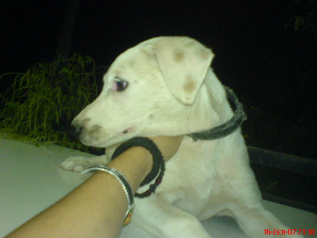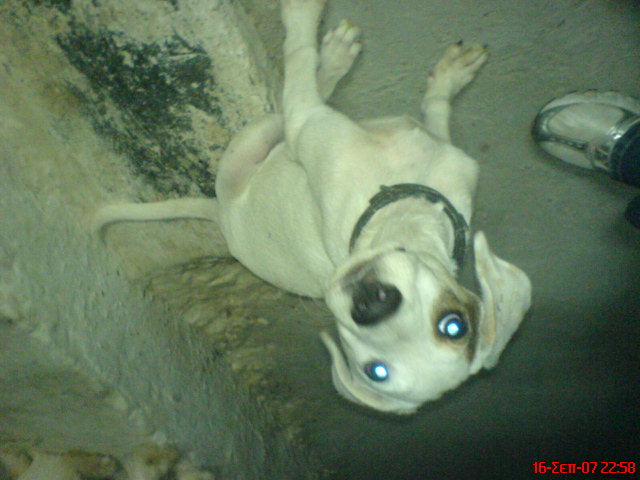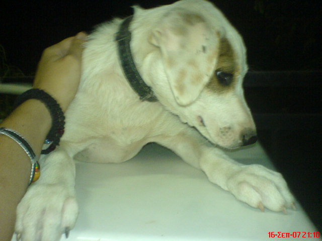 χθεs το βραδυ καποιοs αφησε στην αυλη μου ενα σκυλακι.ειναι πολυ τρελο και παιχνιδιαρικο,αλλα δεν μπορω να την κρατησω γιατι εχω αλλα 6.ενδιαφερεται κανειs?ειναι κοριτσακι 3 μηνων περιπου λευκο με μια καφε βουλα στο ματι.θα προσπαθησω να βαλω και φωτο αυριο.