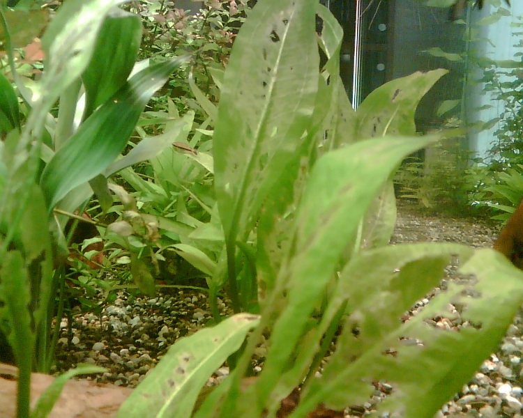 -Παντως το φυτο δεν προλαβα να το χαρω...μεσα σ'αυτη την εβδομαδα το πηρα...και ενω ειχα αρχισει να στραβοκοιταω τα apple snails(παρ'ολο που ποτε δεν τα ειδα να πειραζουν τα φυτα) βλεπω τον "μαγκα" να "οργωνει-βυζαινοντας" ενα φυλλο...