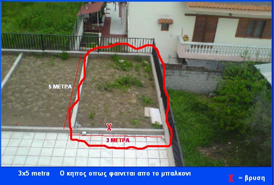 ολος ο χωρος ειναι 3μ χ 5μ προς το παρον εχει παροχη νερου και τελικα θα κατεβασω και ρευμα καθωτη θα υπαρχουν αντλια φωτα μοτερ για ψησταρια για κανενα κατσικακι (νοστιμα που ειναι ) δεν βλεπω λυση με πατεντες σε θεμα ρευματος(οικονομικη τουλαχιστων) αν θελει κανεις να προτεινει καποιες αλλαγες για το στησιμο του κηπου κυριος για το στησιμο της λιμνης