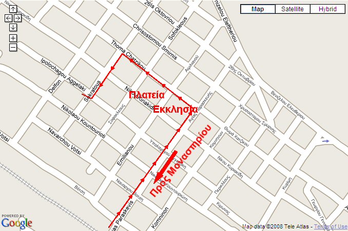 Χάρτης Νο2 (από κέντρο) Περνάμε τον Σιδ. Σταθμό και συνεχίζουμε όλο ευθεία. Μετά από κανένα χιλιόμετρο και μόλις συναντήσουμε στο δεξί μας χέρι την αντιπροσωπεία της Citroen Γιαννίρης στο αμέσως επόμενο φανάρι κάνουμε δεξιά και έχουμε μπει στην Αγ. Παρασκευής. Τα υπόλοιπα στον χάρτη 0. Χάρτης Νο3 (από Αθήνα) Μετά την διασταύρωση Καλοχωρίου περιφερειακού συνεχίζουμε ευθεία και ανεβαίνουμε ψηλά από την αερογέφυρα προς Νέα Δυτ. Είσοδο. Δεν πάμε από δεξιά για λιμάνι. Μόλις ανεβούμε την αερογέφυρα συναντάμε μια ταμπέλα που λέει προς Μοναστηρίου δεξιά. Κάνουμε δεξιά και πάλι δεξιά. Περνάμε τώρα κάτω από την αερογέφυρα που πριν από λίγο είχαμε περάσει από πάνω. Συνεχίζουμε ευθεία στο κυκλάκι. Εκεί παίρνουμε τον δρόμο που οδηγεί στην επόμενη αερογέφυρα. Δεξιά μας, αν είμαστε σωστά, θα πρέπει να βλέπουμε τα ΚΤΕΛ. Μόλις κατεβούμε την αερογέφυρα στο φανάρι κάνουμε ακριβώς δεξιά και έχουμε μπει στην Μενεμένη. Συνεχίζουμε όλο ευθεία καθώς πλέον κινούμαστε στην Θ.Χατζίκου με κατεύθυνση την εκκλησία. Τα υπόλοιπα στον χάρτη 0. |