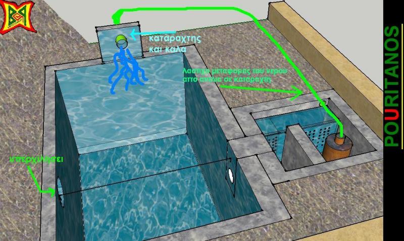 ------------------------- Δείτε και αυτήν την σκέψη.Αν πετύχει 1) αποφεύγουμε την ασχημη αισθητικά εικόνα του κυκλοφορητή και σωλήνων στην λίμνη 2) πανεύκολη συντήρηση καθαρισμό κυκλοφορητή 3)πιο σπάνιο καθαρισμό κυκλοφορητή αφού σκουπίδια άλγες θα μένουν στον πα΄το του φρεατίου τον οποίο θα καθαρίζουμε 4 μέγιστη απόδοση κυκλοφορητή λόγω της διαδρομής που θα χρειαζεται να αναγκασει να κανει το νερο.Το όλο θέμα θα δουλεύει με την μέθοδο των συγκοινωνουντων δοχείων και θα υπάρχει τοποθέτηση του κυκλοφορητή πιο ψηλά ώστε να μην τραβάει σκουπίδια. ------------------------- ΔΕΝ μπορώ να ανεβάσω το σχέδιο....μισό λεπτό Τελευταία επεξεργασία από το χρήστη exetlaios : 13-04-09 στις 17:41 Αιτία: Automerged Doublepost |