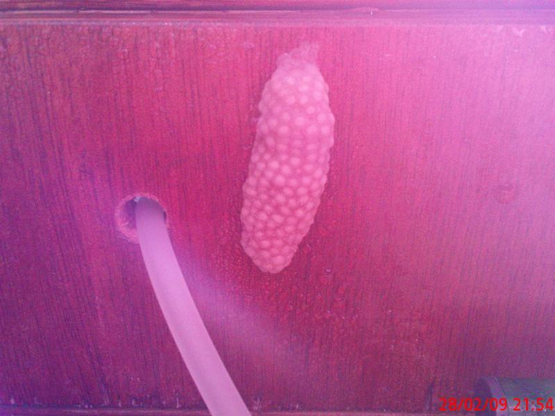 Tα αυγα στο καπακι ειναι σιγουρα απο τα apple αλλα τα αλλα τα ασπρα στο ξυλο δεν ξερω..τα zebra nerite κανουν αυγα αλλα οι νυμφες τους θελουν υφαλμυρο/θαλασσινο νερο για να μεγαλωσουν, χωρια που πρεπει να ειναι και τα 2 φυλα μαζι για να γεννησουν.