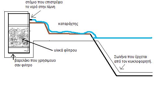Για το φίλτρο, το νερό θα μπαίνει απο το πάνω μέρος κ ένας σωλήνας ή λάστοιχο θα το οδηγεί στον πάτο του βαρελιού. Καθώς γεμίζει το βαρέλι με νερό θα περνάει μέσα απο τα υλικά του φίλτρου κ θα γίνεται η φίλτρανση που θέλουμε κ μόλις φτάσει στο σημείο που υπάρχει το ανοικτό στόμιο θα βγαίνει απο το βαρέλι-φίλτρο και θα πηγαίνει στον καταράχτη κ πάλι μέσα στην λίμνη.