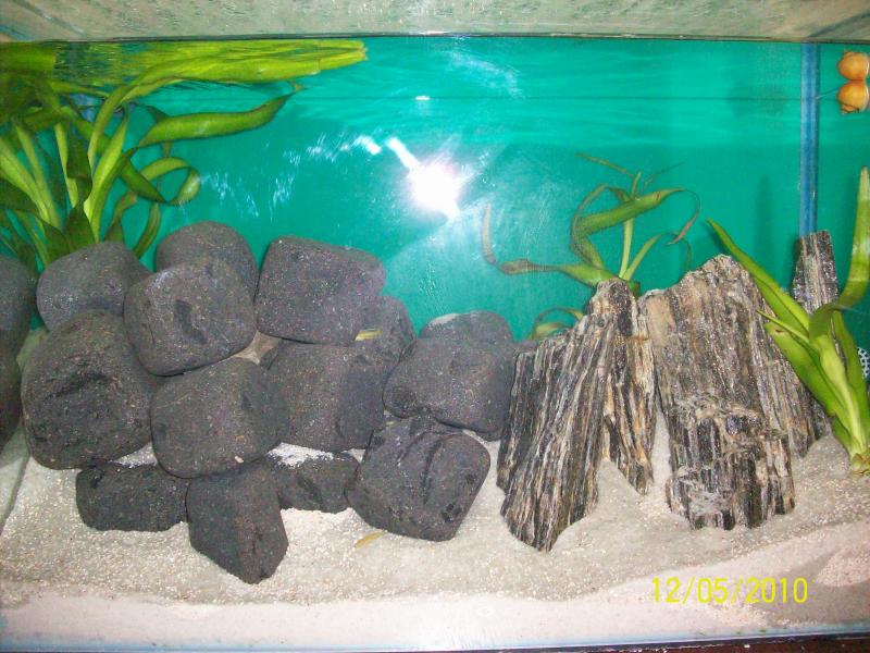 Κλεόβουλε καλή η ιδέα σου να μεγαλώσεις τα μικρά σου σε "αρωματισμένο" περιβάλλον. Επειδή όμως οι διαστάσεις του ενυδρείου είναι μικρές εξέτασε το ενδεχόμενο δημιουργήσεις κάτι σαν τομή της όχθης της λίμνης (το κουβεντιάζαμε εξ άλλου για κάποιο άλλο ενυδρείο