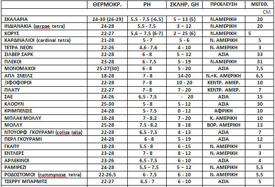 Κι ένας πίνακας με τις βασικές απαιτήσεις των πιο κοινών ψαριών.