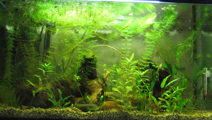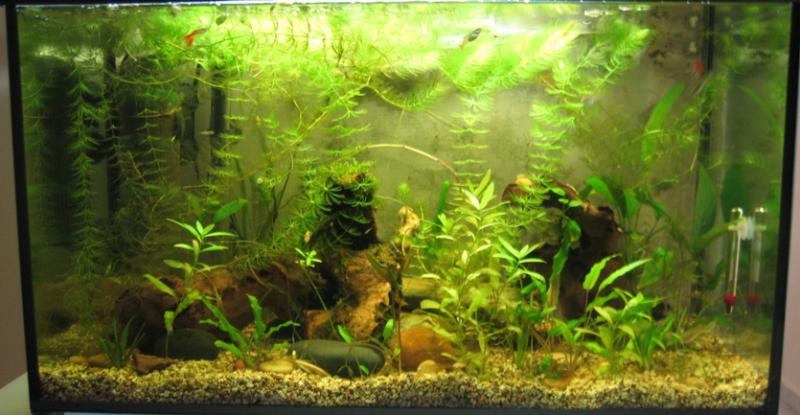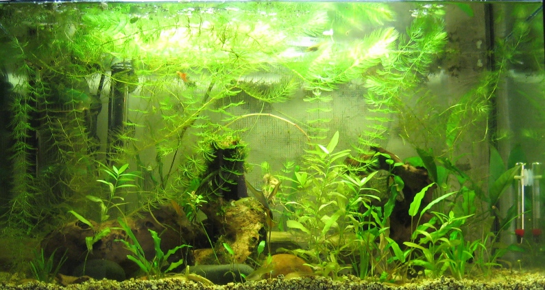 Διαστάσεις: 70x35x40 Όγκος: 98 λίτρα μεικτά Φυτά: 2 Ανούμπιες, 1 ανούμπια νάνα, μπόλικο κερατόφυλλο, java moss/christmass moss wall, κρυπτοκορύνες, vallisnerria, εχινοδορο. Ψάρια / ¶λλα είδη: 7 ενήλικα guppies, πολλά μικρά, 5 red cherry shrimps, 1 apple snail Διακοσμητικά υλικά: 4 μικρές ρίζες μοπάνι, αρκετές πέτρες (ασβεστολιθικές) Φόντο: wannabe java wall Φωτισμός: 2x11 watt compact Διάρκεια φωτισμού: 12 ώρες/ημέρα 9:30πμ-9:30μμ Φιλτράρισμα: EHEIM Aquaball 2210 Θερμοστάτης:Jaegger 100watt Λίπανση: Seachem Flourish - pottasium Παροχή CO2: όχι Παράμετροι: pH: 7.8 Γενική σκληρότητα (GH): 16 Ανθρακική σκληρότητα (ΚΗ): 11 Αμμωνία (ΝΗ3): 0 Νιτρώδη (ΝΟ2): 0 Νιτρικά (ΝΟ3): 0 Αλλαγές νερού: κάθε 10-14 μέρες το 40% Θερμοκρασία: 26.5 Αυτό είναι το ενυδρείο μου. Ο java moss wall κατασκευάστηκε πρόσφατα και αναπτύσσεται αργά αλλά σταθερά. Μόλις άρχισαν να ξεπετούν οι πρώτες μύτες από το πλέγμα. Ελπίζω να τα καταφέρω.. Όσα σχόλια έχετε είναι ευπρόσδεκτα. |