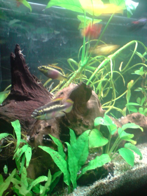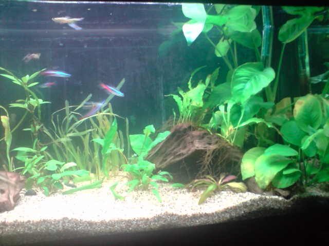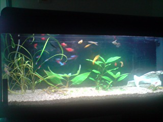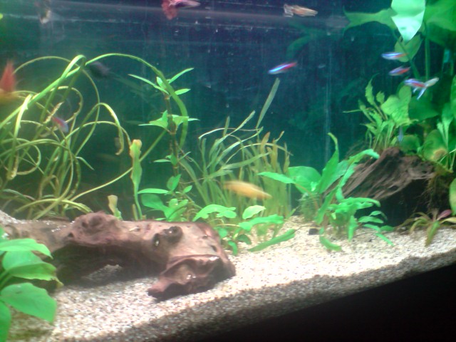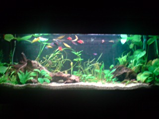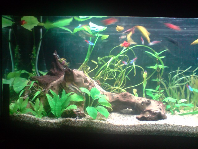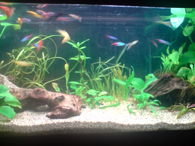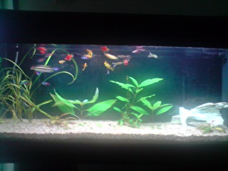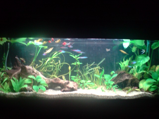 Όγκος:120 λιτρα μικτά,110 καθαρα Κατηγορία:κοινωνικό Φυτά:Vallisneria nana,Anubias barteri var. nana 'Petite',Hygrophila corymbosa ''Stricta'' Ψάρια / ¶λλα είδη:9 Neon,5 gyppy,10 platy,2 kribs Διακοσμητικά υλικά:πετρα και χαλικι ψιλοκοκκο (χαλίκι, ξύλα κ.λ.π.) Φόντο:μαυρο χαρτονι Φωτισμός:2 λαμπες (δεν θυμαμαι ακριβως) Διάρκεια φωτισμού:9 ωρες με χρονοδιακοπτη Φιλτράρισμα:απο φιλτρο πλατης και εξωτερικο c-500 Θερμοστάτης:στους 24 Λίπανση: Παροχή CO2:παροχη απο συστημα σε ιση διαρκεια με το φωτισμο Παράμετροι: pH:7-7,3 Γενική σκληρότητα (GH):10 Ανθρακική σκληρότητα (ΚΗ):7 Αμμωνία (ΝΗ3):0 Νιτρώδη (ΝΟ2):0 Νιτρικά (ΝΟ3):0 Αλλαγές νερού:καθε εβδομαδα σε 30% Θερμοκρασία:25 ¶λλες πληροφορίες:προσφατα μπηκαν τα kribs και αρχικα ειχα προβλημα με τα guppies μου αλλα τελικα προσαρμοστηκαν και τωρα ειναι ολα καλα. Φωτογραφία: |