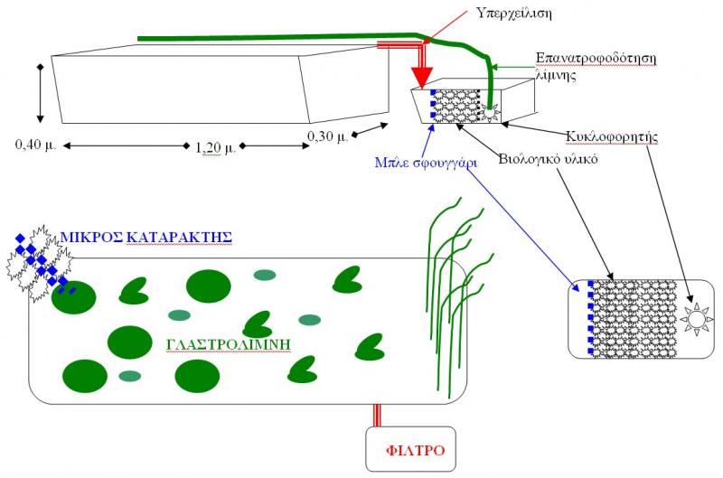 Έχω στο μυαλό μου εδώ και καιρό τη δημιουργία μιας λιμνούλας στο μπαλκόνι μου, αφενός για να ομορφήνει το χώρο και αφετέρου γιατί..... έλα ρε παιδιά ...... ζήλεψα κι'εγώ με αυτά που γράφεται για τις γλαστρολίμνες Σκοπεύω λοιπόν να φτιάξω τη λιμνούλα με 1 πλαστική ζαρντινιέρα (περίπου 120 - 130 λίτρα καθαρά) και σε ξεχωριστό γλαστράκι βιολογικό φίλτρο. Την ζαρντινιέρα-γλάστρα θα επενδύσω εξωτερικά με μονωτικό υλικό, θα την τοποθετήσω πάνω σε κάποια βάση για να είναι λίγο πιο ψηλά από το επίπεδο του μπαλκονιού (10 -30 εκ) ενώ το όλο σύστημα θα επενδυθεί εξωτερικά με πετρούλες για πιο "φυσικό"-αισθητικό αποτέλεσμα. Στο βυθό θα τοποθετηθεί 2-3 εκατοστά χαλίκι ψιλό (από θάλασσα ή ποτάμι) καθώς και μερικές πέτρες (εννοείται όλα μη ασβεστολιθικά). Το νερό θα χύνεται στο φίλτρο με υπερχείληση και με έναν μικρό κυκλοφορητή (300 - 500 λ/ω) θα ξαναεπιστρέφει στη λίμνη από έναν μικρούλη καταράκτη. Στο γλαστράκι που θα φτιάξω για φίλτρο, λέω να βάλω 2-3 λίτρα βιολογικό υλικό (μακαρόνι κλπ) ενώ μάλλον απορίπτω την ιδέα του σφουγγαριού, λόγω εξωτερικού χώρου και αυξημένων ρύπων. Από έρευνα αγοράς έχω βρεί στο νησί πάπυρο και νούφαρα, ενώ θέλω να βάλω καμιά φακή και στρατιώτη, ενώ εντός νερού, κανένα ανθεκτικό φυτό από ενυδρείο. Το μέρος που θα την τοποθετήσω στο μπαλκόνι μου έχει απ'ευθείας ήλιο μόνο τις πρωϊνές ώρες, ενώ προφυλάσσεται από ανέμους και ιδιαίτερα τους βοριάδες, λόγω της θέσης του μπαλκονιού (προς νοτιά) και του πλαϊνού τοίχου που έχει. Στο νησί βέβαια είναι πολύ σπάνια τα φαινόμενα πάγου, όποτε εκεί μάλλον θα είμαι ήσυχος. Τέλος θα αποικίσω το σύστημα με τα 3 φάνσυ χρυσοψαράκια που έχω στο 60λιτρο ενυδρείο μου. Παρακάτω βλέπετε σε πρόχειρο σχέδιο την ......καλπάζουσα φαντασία μου, εεεε την λιμνούλα μου ήθελα να πω. Το θέμα θέτω προς κρίση και παροχή συμβουλών προκειμένου εντός της επόμενης εβδομάδας να ξεκινήσω σιγά -σιγά την υλοποίησή του. |