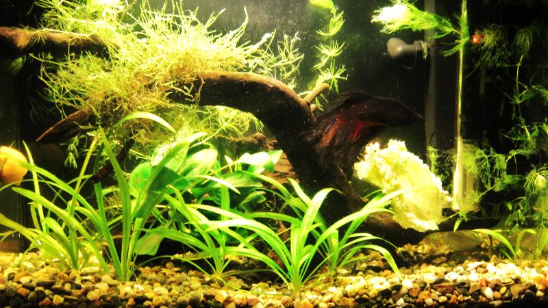 Λοιπον εχουμε και λεμε! Διαστάσεις:44 x 22 x 39 Όγκος:25 λιτρα Κατηγορία:μονομαχιέρα Φυτά:ανουμπια,τζαβα μοςς,βαλισνερια και αυτο το γρασιδι που θα ηθελα να μου πειτε τι ειναι Ψάρια / ¶λλα είδη:betta splendens crowntail+1 apple snail Διακοσμητικά υλικά(χαλίκι, ξύλα κ.λ.π.):χαλικι,δυο ριζες Φόντο:μαυρο χαρτονι(μονο αν θελω να βγαλω μια φοτο της προκοπης) Φωτισμός:1 x 11 Διάρκεια φωτισμού:8-10 ωρες Φιλτράρισμα:εσωτερικο 380l/h Θερμοστάτης:25watt Λίπανση:οχι ακομα Παροχή CO2:οχι Παράμετροι: pH:6,8 Γενική σκληρότητα (GH):7,4 Ανθρακική σκληρότητα (ΚΗ):- Αμμωνία (ΝΗ3):0 Νιτρώδη (ΝΟ2):0 Νιτρικά (ΝΟ3):καπου στο 5 Αλλαγές νερού:1 φορα τη βδομαδα Θερμοκρασία:26-27 αυτο ειναι παιδια!ολες οι αποψεις δεκτες!το ξερω οτι θελει και αλλα φυτα αλλα ψαχνω,ψαχνω!οποιος θα θελε να το δει πιο ζουγκλιτσα εγω ειμαι εδω