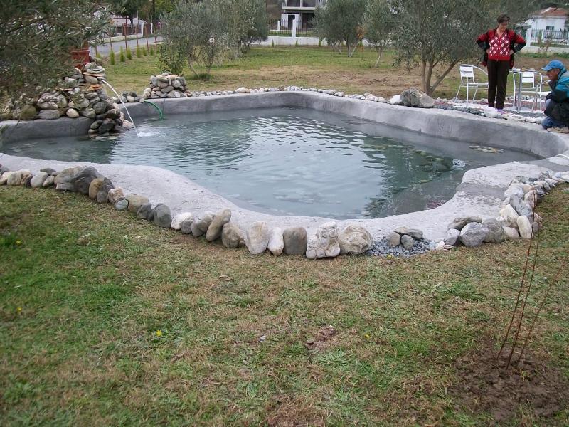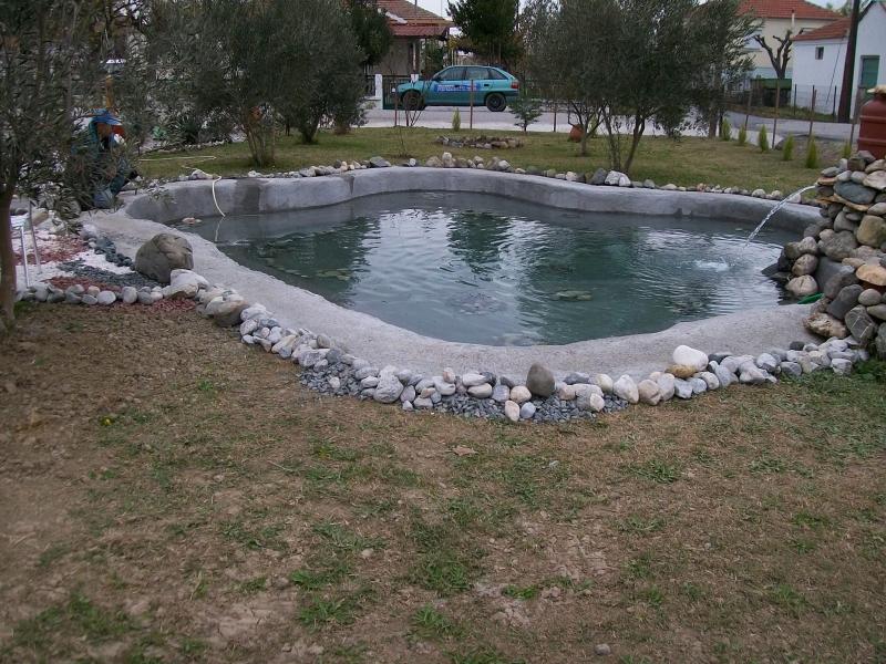 σκαπτικο μου ανοιχε την λιμνη. μετα εγω και ο πατερας μου πηραμε τα χωματα και την καναμε ποιο ομαλη. διαστασεις εχει 8 x 8 περιπου. βαθος 1.60 . χωρητικοτητα 20000 ισως και παραπανο! 8 κυβικα τσιμεντο συν αλλα 2 κυβικα για τσιμεντοκονιαμα. ρητινη εβαζα σε καθε χαρμανιερα. εβαλα πολυ καλο χαλικι ρητινη επισης αυτες που βαζουν και στα υδραγογια. η τσιμεντοκονια την βαλαμε με σπατουλα και μαλα. καναμε ενα πηχτο χαρμανι σαν χυλος ωστε να πεσει μπολικο πραμα και να κλεισουν οι ποροι καλυτερα. τα πετα τα βαλα εγω με τον πατερα μου τον ξαδερφο μου και τον θειο μου που χερει απο τσιμεντα αλλα δεν κανει πλεον αυτη την δουλεια λογο συνταξεις. πολυ κουραση αλλα και ανχος! επσαχνα liner αλλα τιποτα! σημερα αρχισα να την διακοσμω και αυριο σιγα σιγα γεμιζει! θα ανεβασω και αλλες φωτο αυριο!