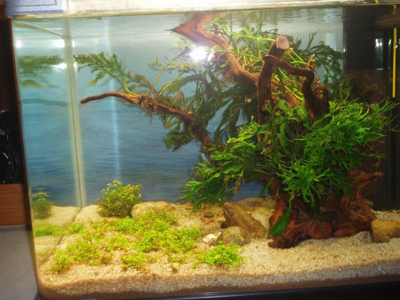 Φυτά: στη ρίζα Bolbitis, microsorum windelov, κάτω Cuba, και Hemiantus micrademoise που θα πάρει δρόμο γιατί δεν... και θα αντικατασταθεί με pogostemon helferi όταν επιτέλους βρώ!!! Τα φυτά εκτός της Cuba τα είχα. Το Hemiantus micrademoise είναι κλάδεμα από το 60 λιτρο και εκεί με τις αρκάδια λάμπες είναι τέλειο. Εδώ, ψόφησε.