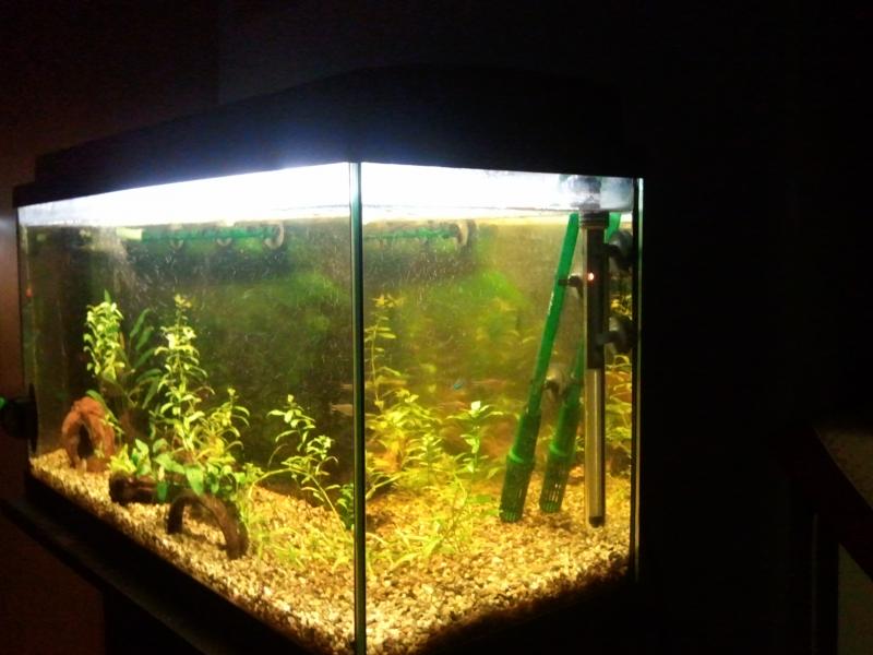 Διαστάσεις:80*30*40 Όγκος:100 λίτρα Κατηγορία: Κοινωνικό Φυτά: 2 Anubias , polysperma Ψάρια / ¶λλα είδη: 2 kribensis, 2 ροδόστομους , 1 neon tetra, 1 pleco Διακοσμητικά υλικά:1 ξύλο mopani και 1 πέτρα (χαλίκι, ξύλα κ.λ.π.) Φόντο:Μαύρο Φωτισμός: 1 Τ8 18watt special plant Διάρκεια φωτισμού:10ώρες Φιλτράρισμα:1 eheim pro 2222, 1 εσωτερικό eheim 2010 Θερμοστάτης:jager 100w Λίπανση:Σταγόνες DANNERLE (Σπάνια) Παροχή CO2: Όχι Παράμετροι: pH:7,5 Γενική σκληρότητα (GH):11 Ανθρακική σκληρότητα (ΚΗ):4 Αμμωνία (ΝΗ3):0 Νιτρώδη (ΝΟ2):0 Νιτρικά (ΝΟ3):15 Αλλαγές νερού:Κάθε 2-3 εβδομάδες το 1/3 Θερμοκρασία:27 ¶λλες πληροφορίες:Τρέχει από τις 24/1/2010, φιλτράρισμα με τύρφη, αλλαγές με νερό δικτύου, υπόστρωμα για φυτά της sera, test με σταγόνες sera Φωτογραφία: |