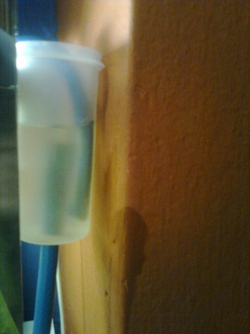 Για εξωτερικο κουτι δεν μπορουσα να χρησιμοποιησω παλι γυαλι γιατι επρεπε να κανω την τριπα για τον σωληνα της υπερχηλησεις.Ετσι η μονη λυση ηταν κατι πλαστικο.Χρειαζομουν ενα πλαστικο δοχειο με 20ποντους υψος και οσο γινοταν πιο στενο 4-5ποντους γιατι δεν ειχα χωρο.Η πιο ευκολη λυση που βρηκα ηταν ενα πλαστικο ποτηρι το οποιο το τρηπισα στον πατο ωστε να μπαινει με ζορι ενα λαστιχο ποτησματος.Ετσι ληθηκε και αυτο το προβλημα.