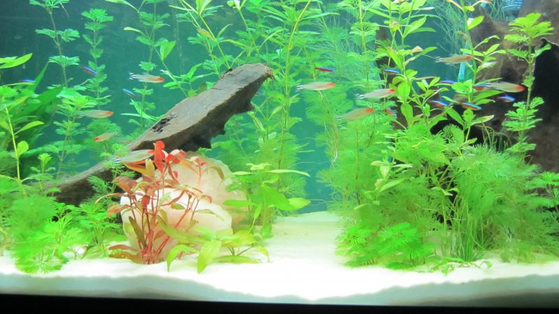 Λιτρα: 180 Διαστασεις: 101 X 41 X 50 Φωτισμος: High-Lite Unit 100cm 2 x 45 W Θερμοστατης: 200W Αεραντλια διπλη με 2 πετρες φυσσαλιδων. Βυθος: Ψιλο χαλικι μπεζ Background: Μαυρη αφισα Υλικα εσωτερικου φιλτρου: 1 μπλε σφουγγαρι,1 λιτρο σιποραξ,2 πρασινα σφουγγαρια και υαλοβαμβακας. Θερμοκρασια: 27 Βαθμους Μετρησεις: NH3/NH4 : 0 NO2: 5mg/l NO3: 25mg/l Ph: 7 Λιπασμα: Flourish Ριζες: 2 Driftwood 1 Mopani Φυτα: Alternanthera reineckii Cabomba Caroliniana Eleocharis parvula Vallisneria americana microsorum pteropus hygrophila difformis hygrophila polysperma Eleocharis vivipara Ψαρια: 16 cardinal tetra 6 hemigrammus bleheri 5 botia striata 2 Albino 3 Bronze cory |