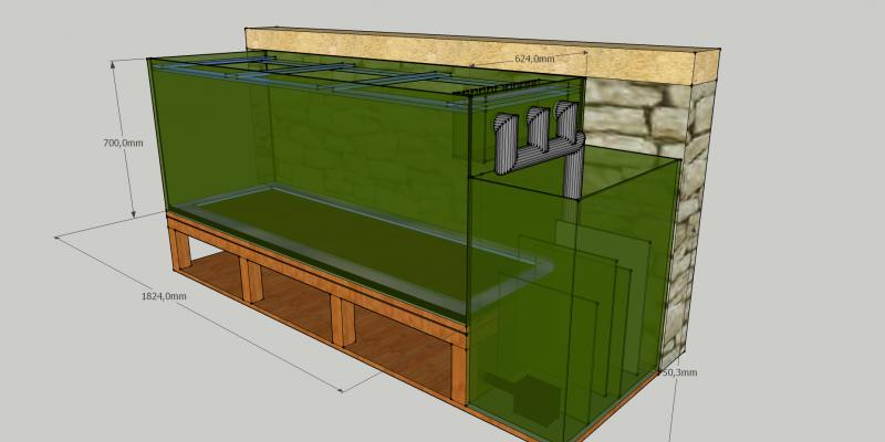 οι διαστασεις 180cm * 60cm * 70cm = 750λτ ειναι μονο το ενυδρειο το sump extra η διαταξη των διαμερισματων ειναι οντως ετσι οπως φαινετε στο σχεδιο σου tsoum και θα το κρυψω σε μια ξυλοκατασκευη επισης θα φροντισω για αποχετευση και παροχη νερου 160λτ για το sump ειναι αρκετα; για τις αλλαγες νερου σκοπευω σε εβδομαδιαιες 150λτ η προετοιμασια του νερου θα γινεται σε δεξαμενουλα 75λτ που θα την μπαινωβγαζω στο μπαλκονι και θα τροφοδοτει το sump ευχαριστω για τις απαντησεις σας |