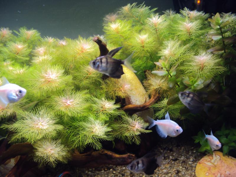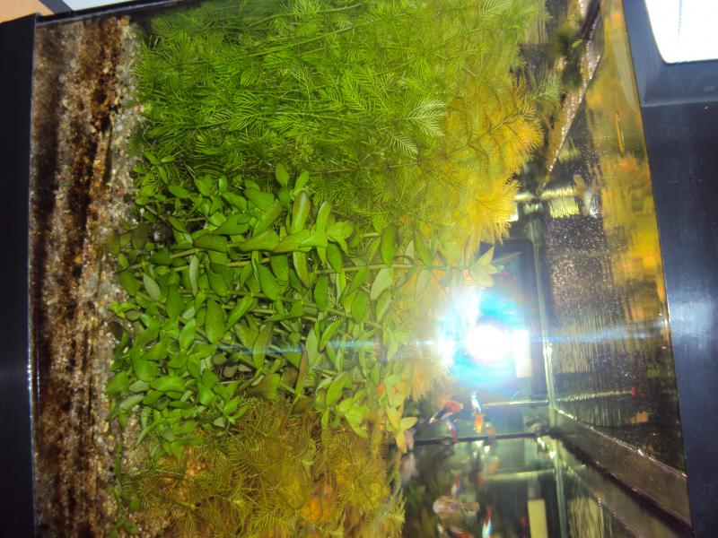 Ογκος... 115, 85 λιτρα καθαρα Φυτα... echinodorus red special,myriophyllum mattogrossense,bacopa caroliniana Ψαρια... 6 x zebra danio, 6 x paracheirodon innesi, 8 x gymocorymbus sp, poecilia reticulata (2 male 3 female) Φωτισμος... 2χ18w philips aquarelle 10.000 k Διαρκεια φωτισμου... 11,5 ωρες Φιλτραρισμα... sera fil 60 (380lt/h) με μαυρα σφουγγαρακια Θερμοστατης... 100w thermal Λιπανση... flourish,flourish exel,flourish tablet Παροχη CO2... ζαχαρη με μαγια, 2 μπουκαλια του 1,5 λιτρων που εναλασονται καθε βδομαδα (1 φυσαλιδα/δευτερολεπτο) η διαχυση γινετε με μια μικρη εσωτερικη αντλια Διακοσμητικα... ξυλα mopani red moor,πετρες μη ασβεστολιθικες rainbow, χαλαζιακη αμμος 1-4 χιλιοστα ph: 6.8-7 kh:8 gh:10 nh3:0 no2:0 no3:10 Η μετρησεις ειναι απο υγρα test της api Αλλαγες νερου... καθε 7 μερες το 1/4 (μισο βρυσης/μισο απιονισμενο) Θερμοκρασια... 24 βαθμοι Το ενυδρείο τρέχει 2χρονια, τα ψαρια μπήκαν το σεπτεμβριο εκτος απο τα γκαπι τα οποια μου ειχαν μεινει απο γεννα και μετα απο ενα μηνα τα εντοπισα. μεχρι το καλοκαιρι ειχα γκαπακια αλλα τα ειχα δωσει πισω στο μαγαζι που τα πηρα. Τα φυτα που εχω τωρα τα εβαλα το νοεμβριο. |