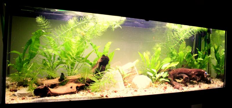 Πολυ καλη αρχη και ομορφα ψαρια πετυχες. Μερικες παρατηρησεις. Δεν ανακατευουμε αμμο με χαλικι για δυο βασικα λογους. Ο ενας αισθητικος αφου η αμμος θα παει σιγα σιγα απο κατω και θα φαινεται μονο το χαλικι και ο αλλος λειτουργικος αφου τα υλικα με διαφορετικο διαμετρημα μπορει να σημιουργησουν μια κατασταση στο βυθο που ευνοουνται οι αναεροβιες περιοχες και οτι συνεπαγονται αυτες σε ενα ενυδρειο γλυκου οπως ειναι η παγιδευση τοξικων αεριων (μεθανιο, υδροθειο). Αυτο θα το ευνοησει επισης και η πολυ χαμηλη κυκλοφορια νερου που εχει το ενυδρειο με το 2213 ιδιως πανω απο το βυθο (θα χρειαστεις wave pump), και η τοποθετηση μεγαλων αντικειμενων οπως τα ξυλα που ακουμπανε στο βυθο με τη μεγαλη επιφανεια τους. Εκει θα μαζευεται σκουπιδι που θα εισχωρει απο κατω τους στο βυθο και θα δημιουργουνται τα αερια. Θα προτεινα να δοκιμασεις μια gro lux στη θεση της μιας λαμπας, Και μαλιστα αυτη να ειναι αυτη που αναβει πρωτη και να σβηνει τελευταια. Ανουμπιες και φτερη (microsorum ) δεν φυτευονται μεσα στο βυθο. (Δεν διακρινω καθαρα πως ειναι τοποθετημενα) Τις δενεις σε ξυλα και πετρες. Οι ανουμπιες σε σκιερα μερη.