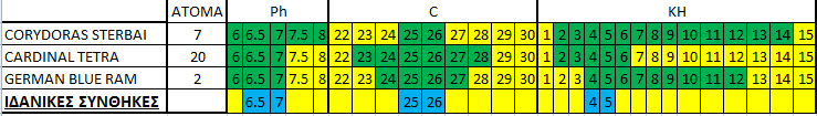 μετά από μελέτη και συμβουλές (σας ευχαριστώ όλους για όσα μου είπατε) κατέληξα στο να δημιουργήσω αυτόν τον πίνακα σχετικά με την ψαροσύνθεση και τις τιμές που πρέπει να κρατάω στον ενυδρείο μου για να κάνω τη ζωή των κατοίκων του όσο το δυνατόν καλύτερη. Ξεκινάω λοιπόν την εισαγωγή των ψαριών σιγά σιγά αφού έχει περάσει ήδη ενάμιση μήνας από το ξεκίνημα του (τα ψάρια που είχαν μπεί και μιλάω περισσότερο για τα γκάπυ έχουν φύγει ...εννοείται σε φιλικό ενυδρείο) και οι τιμές του νερού όλες είναι ικανοποιητικές. Θέλω να πιστεύω ότι την Κυριακή θα είμαι έτοιμος να σας ανεβάσω φωτογραφίες με το οριστικό aquascape (λέμε τώρα γιατί συνέχεια με τρώει και κάνω μικροαλλαγές) του ενυδρείου μαζί με τους κατοίκους καθώς και πλήρη παρουσίαση του με την έτοιμη φόρμα.