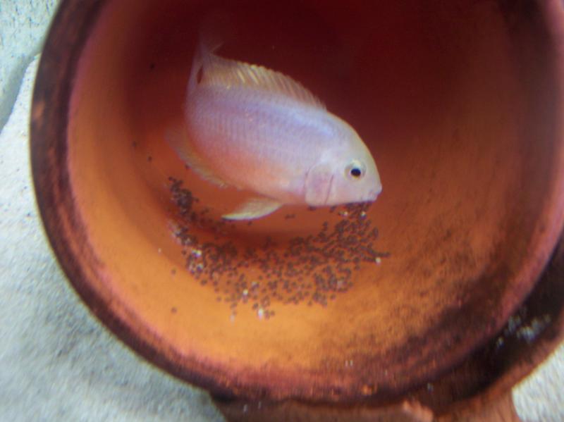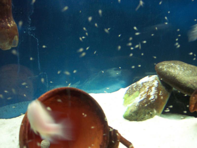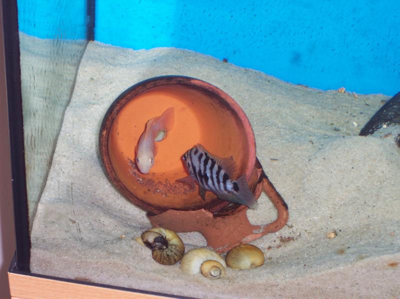 έχω μια γυάλα στα 125 λίτρα με εσωτερικό φίλτρο (juwel rio 125) πριν από 1 εβδομάδα περίπου είχα την πρώτη γέννα από convict. όλα ξεκίνησαν από πριν 10 μήνες περίπου όταν και έδιωξα όλα τα ζωντανά μου και κράτησα μόνο 3 convict μικρά περίπου 2 δάκτυλα μήκος (4 cm) , 2 θηλυκά και ένα αρσενικό και έναν πλεκο,το καλοκαίρι λόγο ζέστης δεν μπορούσαν να κάνουν χωριό ούτε κάποια γέννα λόγο υψηλών θερμοκρασιών (πάνω από 30 c ) και περίμενα να κρυώσει λίγο ο καιρός μπας και δω γεννητούρια ,ξέρω ότι τα κονβικτ μπορούν σε θερμοκρασίες από +18 μέχρι και +34 όμως για γέννα αυστηρά θέλουν μέχρι 26 με 27 θερμοκρασία . κάποια στιγμή όταν και έπεσε η θερμοκρασία κάτω από 30 έβαλα μια μικρή γλάστρα με τρύπα από πίσω (μικρή) έκανα σπηλιές με πέτρες και περίμενα. το ένα το θηλυκό (άσπρο) είχε μεγαλώσει ποιο πολύ από το άλλο δεν ξέρω γιατί υποθέτω ότι επειδή ταίριαξε με το αρσενικό και έκαναν συμμορία και δεν άφηναν το άλλο (το μικρότερο σωματικά) να έχει καλύτερη πρόσβαση στην τροφή που έριχνα, έτσι πριν από 8 μέρες περίπου είδα τα πρώτα αυγά μέσα στην γλάστρα (καμιά 100 αν δεν κάνω λάθος) και την άσπρη θηλυκια να τα αερίζει με τα πτερύγια της συνέχεια και όταν έκανε βόλτα για τροφή (που έριχνα εγώ) γυρνούσε εσπευσμένα στην φωλιά της με την βοήθεια πάντα του αρσενικού του οποίου δεν άφηνε να πλησίαση ούτε καρχαρίας σε ακτίνα 2 χιλιόμετρων. κάποια στιγμή τα αυγά έσπασαν και άρχισαν να φαίνετε οι ουρίτσες τους (μετά από περίπου 5 μέρες) και ήταν στο βάθος της γλάστρας και περίμεναν ,δεν ξέρω τι αλλά δεν το κουνούσαν ρούπι από εκεί και με την μάνα στην είσοδο και να τσαμπουκαλεβετε ακόμα και στον σύζυγο της . Σήμερα είδα τα μικρά να είναι έξω από τι γλάστρα και έχουν κολιση σε ένα άλλο πιθάρι που έχω στην είσοδο της γλάστρας με μπόλικη άλγη και τρέφονται εκεί . από ότι έχω διαβάσει στο ΝΕΤ δεν έχουν και ιδιαίτερο πρόβλημα τροφής τα νεογνά διότι τρώνε διαφόρους μικροοργανισμούς που υπάρχουν μέσα στην άμμο και όχι μόνο. μολις μεγαλωσουν λιγο τα νεογνα και δω οτι η θηλυκια ετοιμαστη για νεα γεννα θα βαλλω πολλα φυτα μεσα πλαστικα (για να μην τα φανε ) και πετρες επισης με πολλες κρυψωνες για να μπορεσουν να κρυφτουν απο τους γονεις διοτι αν γενηση παλι η θηλυκια θα ξεχασει οτι εχει και αλλο γονο μεσα και θα τα φαει . αυτο το συμπερασμα εβγαλα απο πολυωρη μελετη στο νετ παντα και με εμπειρειες αλλον συνχομπιστων . αν κανω λαθος σε κατι ας με διορθωσετε. |