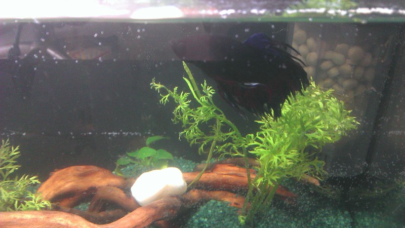 Εδώ και κανένα 8μηνο έχω ένα μονομάχο (crowntail) το Μπάμπη, δυστυχώς ελλείψει χώρου σε ένα 20ρι με 3 Helena σαλιγκάρια (για καταστολή των λαθρεπιβατών που μόνος μου είχα ρίξει μέσα...). Πρόσφατα του έκανα ανακαίνιση και του έβγαλα όλα τα μπιχλιμπίδια που είχε μέσα και έτσι κι αλλιώς δεν τιμούσε (κάτι κεραμικά ξύλα μικρούλια) και του έβαλα αληθινό driftwood (μικρά κομματάκια λόγω έλλειψης λίτρων), μια "ντοματιά" και λίγηriccia fluitans δεμένη με νήμα πάνω σε ένα από τα ξυλάκια. Δεν ξέρω αν το περιβάλλον τον καλύπτει και ήθελα να ρωτήσω για επιπλέον παρεμβάσεις. Επίσης επειδή πάντα τον είχα με παρέα (είναι πολύ ήσυχος και δεν ενοχλεί τα κορίτσια) του έχω μαζί και μια μικρούλα λευκή μονομαχίνα. Δεν έχω βλέψεις προς αναπαραγωγή απλά εφόσον δεν την πειράζει δεν την απομάκρυνα... Και μερικές εικόνες για να μου πείτε αν είναι να αλλάξω κάτι. |