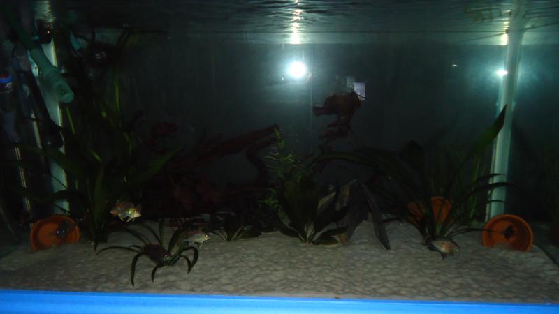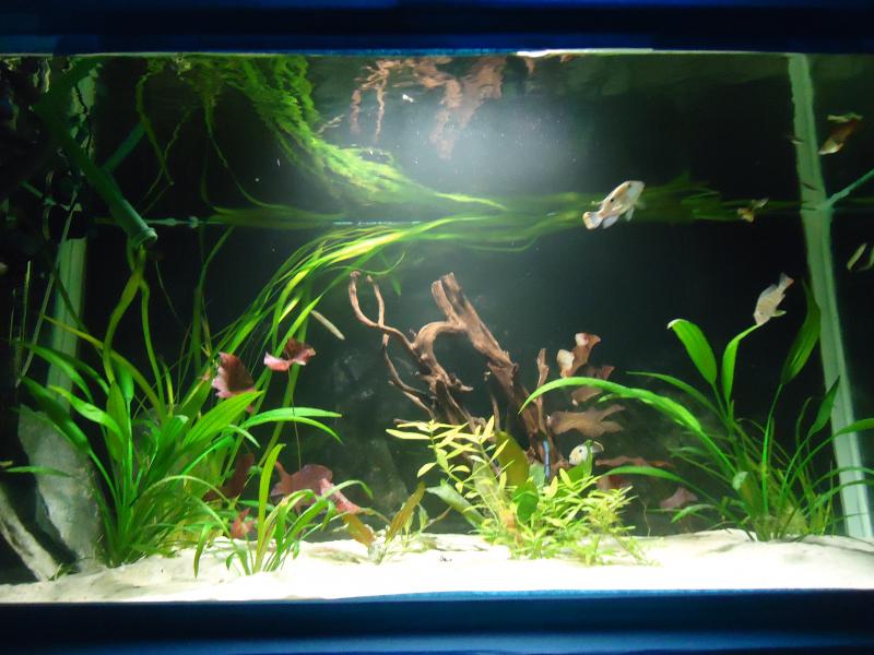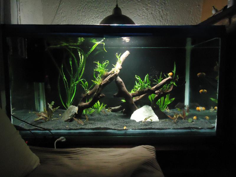 Φωτισμος: Kρεμαστο φωτιστηκο με λαμπα οικονομιας αποδοσης 2000lumen και 4000K. Απο φυτα εχουν μπει: Dιαφοροι Echinodorus kai Nyphea Lutous. Διακοσμηση: Mερικες πετρες και μια ριζα. Φοντο: Φελιζολ DOW βαμενο μαυρο για λογους οικονομιας. Φιλτρανση: υπαρχουν 2 φιλτρα 1 Prime 30 και 1 Fluval 305. |