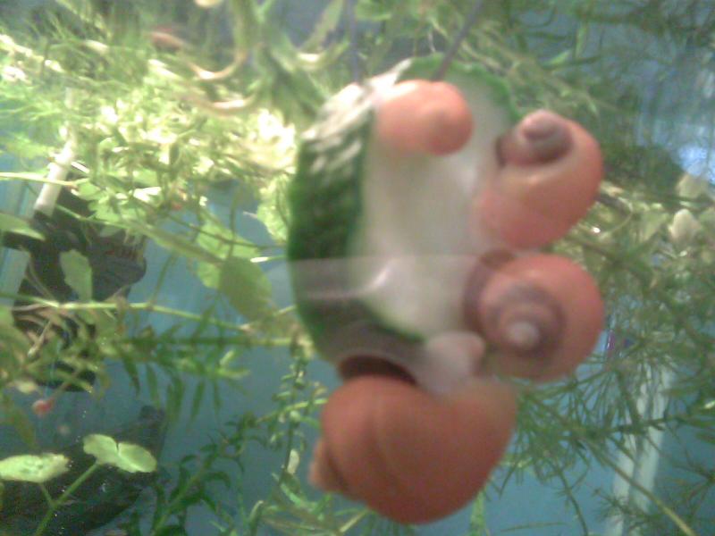 πρίν απο λίγες μέρες άρχισα να δοκιμάζω διάφορα λαχανικά στα apple snails ...τους έβαλα καρότο , μαρούλι , μπρόκολο....τα τιμούσαν όλα μα με αυτο που μόλις το βάλω σε 10 λεπτα το έχουν περικυκλώσει όλα είναι το αγγούρι ... να μερικές φωτογραφίες