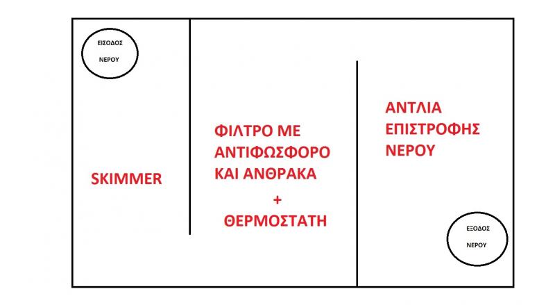 Οι διαστασεις του sump θα ειναι: 50(M)*35(Y)*15(Π)=26,25 ΛΙΤΡΑ Την διαταξη την εχω σκεφτει καπως ετσι οπως εχω σχεδιασει στο σχεδιο παρακατω. Περιμενω γνωμες και προτασεις. |