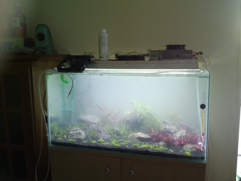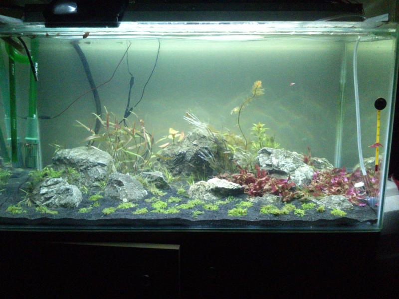 Είναι θολό λόγο τής σκόνης του υποστρώματος καθώς όσο και να το πλύνεις βγάζει.. Τα φυτά τα κατάφεραν οριακά μετά απο μερικές μέρες σε cooler μαζί με αεραντλια, λίπασμα κ εξελ. Τα περισσότερα είχαν ξεκινήσει να χαλάνε και μερικά είχαν χάσει τελείως τα φύλλα τούς.. Hardscape : Butterfly vs jimbit22 Plants : Jimbit22 Το φωτιστικό τρέχει στα 80 βαττ λόγο προβλήματος με τον ένα driver αλλά θα αναβαθμιστεί σε αυτόν τον τομέα.. Σκέφτομαι να τα μετακομίσω σε μεγαλύτερο αν υπάρξει η ευκαιρία.. Για υπόστρωμα επέλεξα δύο σακούλες seachem fourite black sand Το co2 είναι στις δυο φυσ. /Δευτ για μερικές ημέρες μεχρι να συνέλθουν τα φυτά και πέφτουν diy λιπάσματα εδώ και καιρό.. Οι πέτρες για το hardscape είναι μαζεμένες από χωριό εδώ και κάνα εξάμηνο από περιοχή με ηφαιστειογενη πετρώματα και τα φυτά είναι τα ίδια που είχα στο προηγούμενο aquascape.. Όταν βρεθεί χρόνος θέλω να γράψω κ γ την εμπειρία μ με τον φωτισμό led στο φυτεμένο..