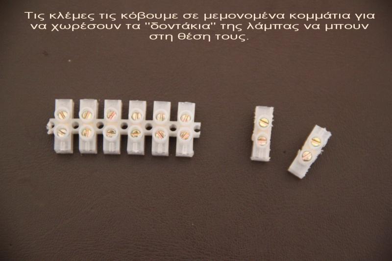Σχίζεις το θερμοσυστελόμενο και ξεβιδώνεις τις κλεμες. Περνάς τη νέα λάμπα στις κλέμες αφού έχεις περάσει μέσα σε αυτη απο τις δυο πλευρές το νέο θερμοσυστελόμενο πρώτα και απλα το ζεσταίνεις πάνω απο τη σύνδεση. Έτυχε να αλλάξω λάμπα και δεν έκανα ούτε 3 λεπτα. Πανεύκολο ειναι ειδικα αν δε βάλεις τη μονωτική ταινία η οποια αποδείχθηκε στην πράξη οτι δε προσέφερε τίποτα απολύτως παρα μονο δυσκολία στο να την αφαιρέσεις οταν χρειαστεί χαχαχα. Τα αυτοσχέδια ακροφύσια ηταν απόλυτα στεγανά.