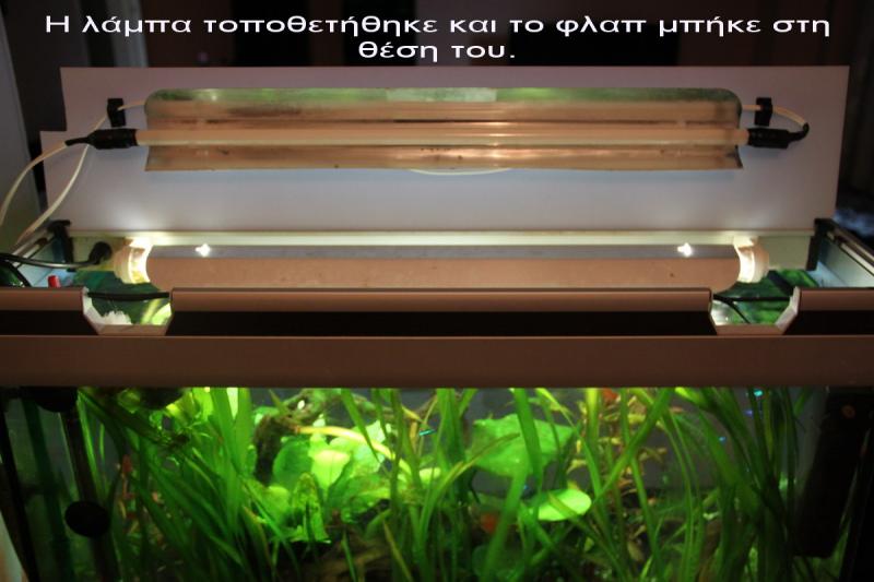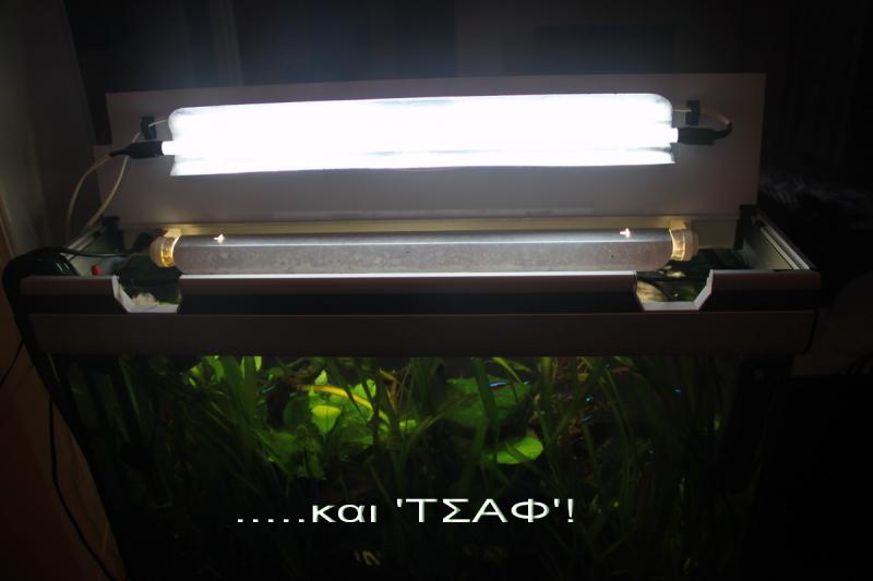 Καλησπέρα στην παρέα. Ο φωτισμός του ενυδρείου μου (2x28W - T5, 4100 και 6800 Kelvin) δεν επαρκούσε καθόσον η απόσταση του φωτιστικού από τον βυθό είναι στα 43 εκατοστά περίπου και στη γυάλα μου φιλοξενώ πέρα από τα ζωντανά και κάποια φυτά, εύκολα μεν, με μέτρια ανάπτυξη δε. Παρουσιάζω λοιπόν την DΙΥ κατασκευή προσθήκης τρίτης λάμπας (Τ5 28W - 6800K) στο ενυδρείο μου οχι επειδή είναι κάτι ιδιαίτερο ή δύσκολο αλλά για να δώσω καμιά ιδέα σε κάποιον σε περίπτωση που χρειαστεί.
