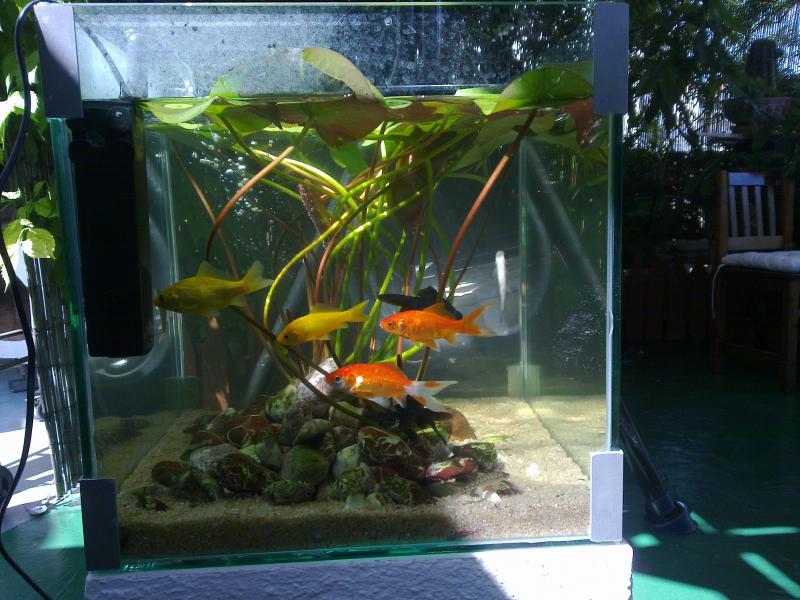 Για σας και πάλι παιδιά. Αυτό είναι το 1ο ενυδρείο που ασχολήθηκα. Όλα ξεκίνησαν τον Μάιο του 2012 όταν ένας φίλος μου χάρισε 1 νούφαρο για το ταρατσόκηπο μου. Στην αρχή έφτιαξα τη γυάλα σε ένα φίλο τζαμά και αφού μπήκε το νούφαρο μου πετάξανε την ιδέα να βάλω και κανα χρυσόψαρο μέσα. Αυτό ήταν, έφαγα κόλλημα. Φυσικά τότε άρχισαν και τα ΠΟΛΛΑ και τα ΜΕΓΑΛΑ λάθη. Ξεκίνησα με 2 χρυσόψαρα και έφτασα να έχω 10 χρυσόψαρα, 2 pleco, 4 chinesealgaeeaterκαι καμιά 12αρια Gappy. Με τις μεγάλες ζέστες άρχισα να χάνω τα gappy, κατάλαβα πως κάτι δεν πάει καλά, γιατί δεν πέθαιναν αλλά τα έβρισκα έξω από το ενυδρείο ή ψόφια πάνω στα φύλλα του νούφαρου. Τότε ασχολήθηκα να ψάχνω στο internet και άρχισα να διαβάζω γενικότερα και έμαθα κάτι λίγα πραγματάκια. Ίσως να ήμουνα και λίγο τυχερός γιατί εκτός από τα gappy δεν είχα άλλες απώλειες εκτός από ένα χρυσόψαρο μικρό που χτύπησα κατά λάθος με τη βούρτσα που καθάριζα το ενυδρείο, πολύ στεναχώρια τότε, πάρα πολύ.