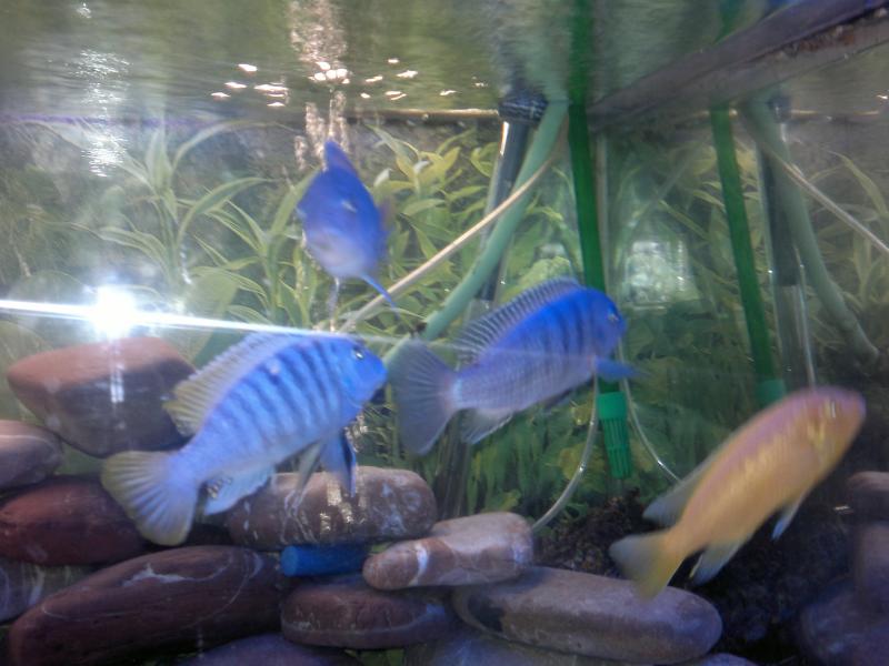 το πρωτο ειναι υβριδιο φουλ τα αλλα 3 ειναι Metriaclima greshakei το μπλε ειναι αρσενικο και τα δυο γκρι θυληκα .