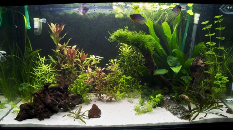 Να πω ότι από την αρχή ξεκίνησα έχοντας αληθινά φυτά (ανούμπιες, βαλισνέριες), αλλά μετά από ένα χρόνο που ασχολούμαι είπα να πάω λίγο παραπέρα. Έτσι αφού αύξησα λίγο τον φωτισμό (1 επιπλέον λάμπα Τ5 24watt) και πρόσθεσα μπουκάλα co2 άρχισα να βάζω πιο απαιτητικά φυτά.