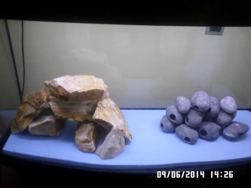 Η αριστερή στίβα με πέτρες μου αρέσει πολύ σαν πέτρα αλλά και το στήσιμο, βάλε το χέρι πάνω και πίεσε όπως σου είπα για να δοκιμάσεις αν είναι σταθερές.Η δεξιά στίβα χρειάζεται πολλές ακόμα,προτίμησε να τις βάλεις κάτω και ψηλά στήσε τις ψεύτικες που 'χουν τρύπες προσπαθώντας ν' αφήσεις κενέ ανάμεσα τους για να κυκλοφορούν τα ψάρια.Αριστερά μπροστά αν δεν έχει κενό το Dow από το τζάμι κόψε το λίγο για ν' αφήσει 2εκ. κενό,το ίδιο και στην πλευρά που φαίνεται.
