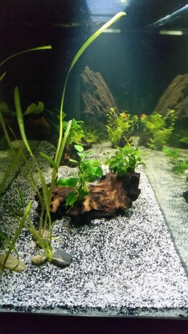 Διακοσμητικά υλικά: Χαλαζιακό ψιλό χαλίκι [ανοιχτό μπεζ (15 κιλά) και μαύρο (5 κιλά) ανακατεμένα], 2 mopani, 1 driftwood, λίγα "ενυδρειακά" βότσαλα (περισσότερο για στήριξη).