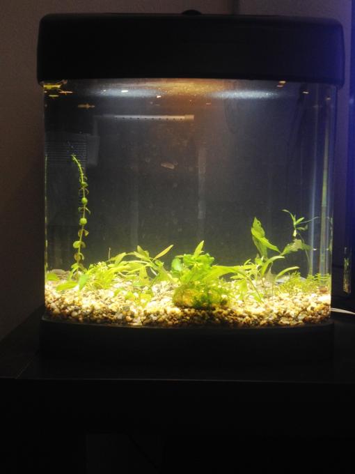 φωτισμο εχει 2 σποτ led 6watt cool white και μια λαμπα οικονομιας 11watt warm white . εσωτερικο φιλτρακι 300λ/ω με substrat pro και σφουγκαρι . Βυθο εχει φυσικο χαλικι αναμικτο λεπτο με χονδρο. απο φυτα εχω βαλει: hygrophyla polysperma,limnofila ,java moss,ceratopteris,pistia , cryptocorine wendi green,sagitaria subulata ,bacoba caroliana(ή monieri ) και ενα ακομη π δεν θυμαμαι ονομα . Λιπανση βαζω power4 και ταμπλετες βυθου θερμοκρασια :24-25 χωρις θερμοστατη τωρα καλοκαιρι ph:8 νερο βρυσης Το ενυδρειακι προοριζεται για γκαπι αρσενικα και σαλιγκαρια και ισως καμια γαριδα αργοτερα |