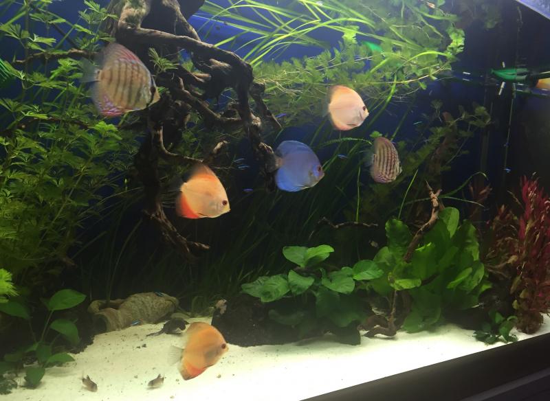 Διαστάσεις:150x65x70 Όγκος:600λιτρα καθαρά Κατηγορία: Φυτά:anubias,velisneria,echinodorus,ludwigia,cambo ba. Ψάρια / ¶λλα είδη:6 stendker δίσκοι,20 Cardinal,10 panda Cory,6 julli Cory,4 anqistrus 2 Helena snail,2 Apple snail Ξύλα άμμος : 3 ρίζες red moorwood,λευκή χαλαζιακη Φόντο:σκούρο μπλε Φωτισμός:2 t8 x39watt Διάρκεια φωτισμού:8 ώρες Φιλτράρισμα:2x eheim 2217 με Φούλ βιολογικό υλικό Θερμοστάτης:2 jäger x300watt Λίπανση:υπόστρωμα τις sera Παροχή CO2: Παράμετροι: pH:6,8 Γενική σκληρότητα (GH):2 Ανθρακική σκληρότητα (ΚΗ):2 Αμμωνία (ΝΗ3):0 Νιτρώδη (ΝΟ2):0 Νιτρικά (ΝΟ3):5 Αλλαγές νερού:100 λίτρα κάθε 3 μέρες με α/ο 80% 20% βρύση με prime τις sheachem και discus trace Θερμοκρασία:29 Τάισμα 3 φορές τι μερα με 1 (Tetra algae) 2 (tropical gran D50 plus) 3 (tropical astacolor) έδινα και κατεψυγμένη stendker και ο ένας εμφάνισε εντερικά.μολις τι σταμάτησα του πέρασε και εδω και 15 μέρες δεν την εχω δωσει αλλο Βεβαια τα ψάρια είχαν τρελή ανάπτυξη αρχικά.οι δίσκοι ηταν 5 και 6,5 cm και αυτοί τη στιγμή ειναι 6,5 και 8 σίγουρα.εχουν εμφανίσει χρώματα και πίσω λέω πως ειναι υγιέστατοι δραστήριοι και πεινάνε συνεχώς! |