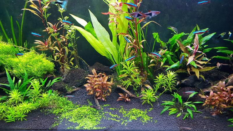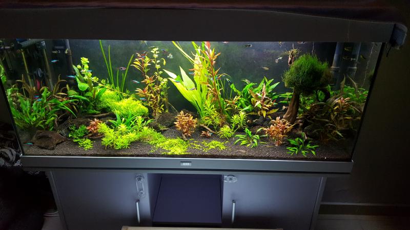 Όγκος:240 λιτρα Κατηγορία:κοινωνικό φυτεμένο Φυτά:ανουμπιες,Moss,κρυπτοκορινες,monte carlo,pogostemon, βαλινσεριες και αλλα Ψάρια / ¶λλα είδη:Black neon, cardinal tetra, αρλεκινοι και μερικά γκαπυς που θα φύγουν άμεσα λόγω συνθηκών νερου Ασπονδυλα:γαρίδες amano και μερικά σαλιγκάρια neritina Διακοσμητικά υλικά:υπόστρωμα stratum fluval, πέτρες λάβας και ξύλα (χαλίκι, ξύλα κ.λ.π.) Φόντο:μαύρο χαρτόνι Φωτισμός:2χ39 Τ5 λευκό και 1χ39 Τ5 ροζ Διάρκεια φωτισμού:8 ώρες Φιλτράρισμα: sun sun 302 , sun sun 304b Θερμοστάτης:eheim jagger 150 watt Λίπανση:- Παροχή CO2: 24ωρη παροχή με μπουκάλα μέσω diffuser ista max mix Παράμετροι: pH:6,8 Γενική σκληρότητα (GH):9 Ανθρακική σκληρότητα (ΚΗ):7 Αμμωνία (ΝΗ3):0 Νιτρώδη (ΝΟ2):0 Νιτρικά (ΝΟ3):10 Αλλαγές νερού:εβδομαδιαία 30% Θερμοκρασία:26,5 ¶λλες πληροφορίες:το ενυδρείο τρέχει περίπου 1 μήνα Δέκτες οποιεσδήποτε παρατηρήσεις Φωτογραφία