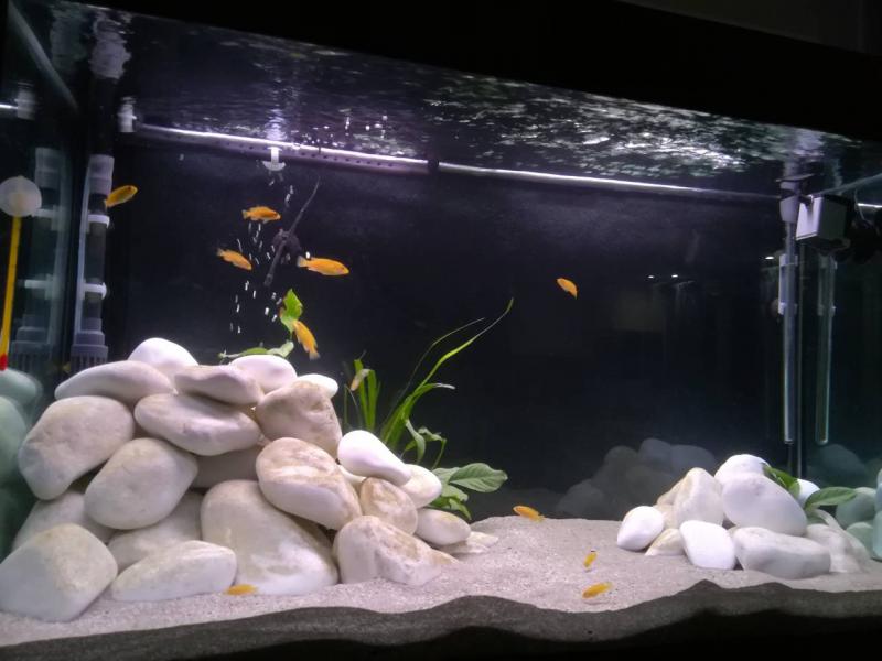 Διαστάσεις:100*40*60 Όγκος:240lt Κατηγορία:Malawi Φυτά:Valisneria-Anubias Ψάρια / Άλλα είδη:7 Pseudotropheus Saulosi 3 Labidochromis sp. Yellow Διακοσμητικά υλικά:Βοτσαλο (χαλίκι, ξύλα κ.λ.π.) 50% Αμμος θαλασσης,50% Αραγωνιτης Φόντο:Βαμμενο μαυρο φελιζολ dow Φωτισμός:1 ροζ T5 39w Διάρκεια φωτισμού:8 ωρες Φιλτράρισμα:Fluval 405 Θερμοστάτης:300w Λίπανση: Παροχή CO2: Παράμετροι: Set kit Api pH:8 Γενική σκληρότητα (GH): Ανθρακική σκληρότητα (ΚΗ): Αμμωνία (ΝΗ3):0 Νιτρώδη (ΝΟ2):0 Νιτρικά (ΝΟ3):5 Αλλαγές νερού:25% καθε εβδομαδα Θερμοκρασία:27οC Τροφες της Ocean Nutrition. |