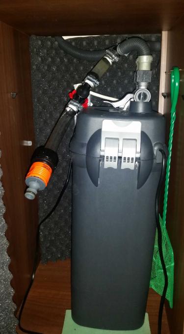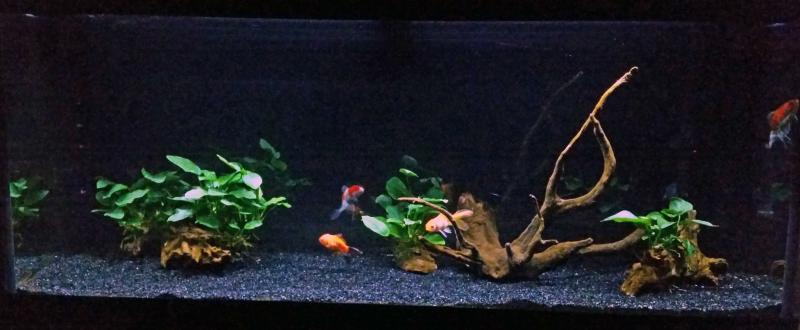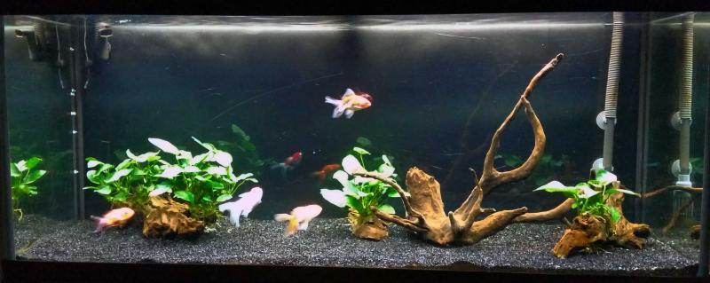 Πληροφορίες: Είδος ενυδρείου: Fancy χρυσοψαράδικο. Διαστάσεις: 121 x 41 x 55 (Juwel Rio 240). Όγκος: 240 λίτρα (205 καθαρά). Ποικιλίες χρυσόψαρων: 4 fancy χρυσόψαρα (3 oranda και 1 fantail). ¶λλοι συγκάτοικοι: 1 apple snail και 1 zebra nerite. Φυτά: Anubias (4 ρίζες). Διακοσμητικά υλικά: Μαύρο «ενυδρειακό» χαλίκι (ψιλό), 3 ξύλα mopani και 1 ρίζα redmoor. Φόντο: Μαύρο χαρτόνι. Φωτισμός: 2 λάμπες Τ5 (54W στα 8000Κ και 54W στα 4100Κ) για 2 ώρες + 1 ταινία led 14,4W στα 6400Κ για 6 ώρες συνολικά (ανάβει 2 ώρες πριν τις Τ5 και σβήνει 2 ώρες μετά). Μέσα Φιλτραρίσματος: Εξωτερικό φίλτρο Fluval 405 (με το χοντρό σφουγγάρι του, λίγο ψιλό σφουγγάρι κάτω-κάτω, όλο το υπόλοιπο γεμάτο βιολογικό υλικό, μια στρώση ενυδρειακό βαμβάκι στο τέλος). Μέσα Θέρμανσης: - (Θερμαντήρας JBL 300W, για τοποθέτηση μόνο σε περιπτώσεις ανάγκης). Μέσα Ψύξης: 4 ανεμιστήρες Konig 92mm (3 βάζουν, 1 βγάζει) - συνδεδεμένοι με STC-1000. Λίπανση: Όχι. Παροχή CO2: Όχι. Παράμετροι: pH: 7,5 Γενική σκληρότητα (GH): - Ανθρακική σκληρότητα (ΚΗ): - Αμμωνία (ΝΗ3): 0 Νιτρώδη (ΝΟ2): 0 Νιτρικά (ΝΟ3): 0-10 Αλλαγές νερού(% και συχνότητα): 30% μία φορά την εβδομάδα (νερό από βρύση με διπλό φίλτρο άνθρακα, θέρμανση με ταχυθερμαντήρα 2000W σε βαρέλι, αλλαγή με σύστημα σωλήνων πατέντας delta66). Θερμοκρασία (μέση τιμή): Αναλόγως με την εποχή (τώρα περίπου 22C). Έλεγχος με STC-1000. ¶λλες πληροφορίες: Με το συγκεκριμένο στήσιμο το ενυδρείο λειτουργεί από το Νοέμβριο του 2016. Φωτογραφίες: |