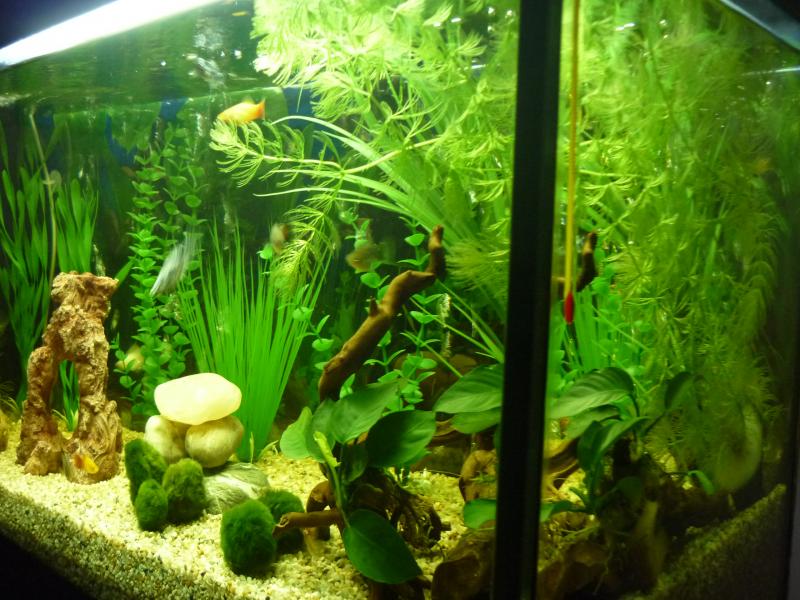 Σας παρουσιάζω το ενυδρείο μου το οποίο είναι 4 εβδομάδων. Μόλις πρίν από 2 μέρες έβαλα μέσα ζωοτόκα ψαράκια και μάλιστα είχα και γεννητούρια. Σαν αρχάριος έκανα ότι μπορούσα για αυτή την πρώτη προσπάθεια μου. Συγχωρέστε με για τα λίγα πλαστικά φυτά που έβαλα μαζί με τα αληθινά. Απλά γεμίζει το ενυδρείο και στα δικά μου μάτια τουλάχιστον φαίνεται πιο όμορφο. Θα τα αντικαταστήσω όλα με αληθινά κάποια στιγμή