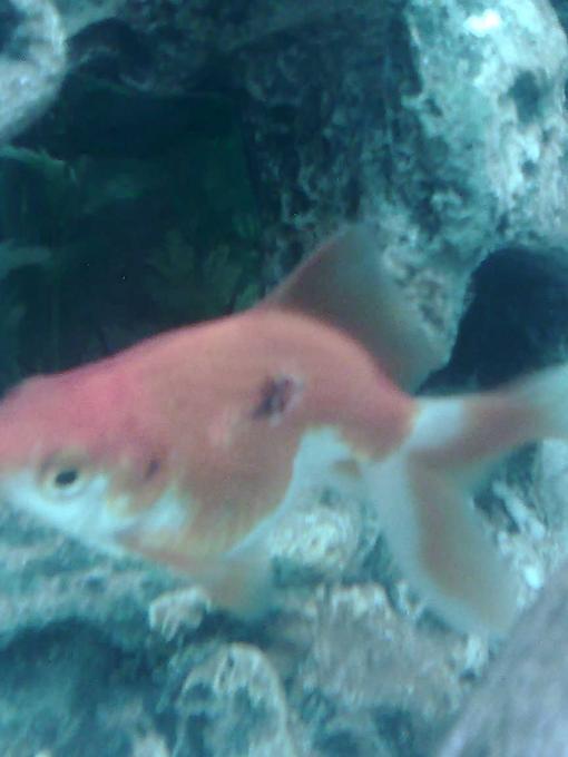Το κοκκινο χρυσόψαρο (fantail) μάλλον έχει έλκος και το μπλακμουρ καποιο