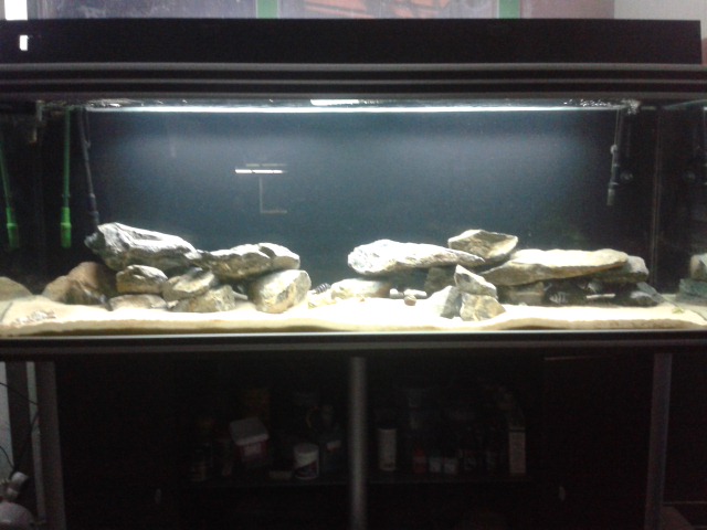 Τελικά αποφάσισα να το κάνω μαλάουι για αρχή το ενυδρείο και αργότερα που θα έχω λεφτά θα το κάνω τανγκανίκα με φροντόζες. Ξεκίνησα από της 8 σήμερα, πήγα Υμηττό μάζεψα πέτρες γύρισα στο μαγαζί τις έπλυνα, έπλυνα την άμμο και ξεκίνησα το στήσιμο. Για φίλτρανση έβαλα 2 eheim professionel 2 με 1050 λτ/ω το καθένα, με σκέτο υαλοβάμβακα και άνθρακα για να καθαρίσει τη θολούρα και αύριο θα μπει η βιολογία και ενα san san με 1400 λτ/ω και ένα 2217. Είμαι λίγο υπερβολικός με τη φίλτρανση αλλά νομίζω είμαι υπερκομπλέ τωρα. Και για βελτίωση της κυκλοφορίας έβαλα 2 κυκλοφοριτές της jbl με 1000 λτ/ω ο καθένας. Για έλενχο στα φώτα και στους θερμοστάτες θα χρησιμοποιήσω το κοντρόλερ της iks aquatar. Και σιγά σιγά θα τον έχω και για απομακρυσμένο έλενχο. Τον είχα αγγελία αλλά τελικά θα τον κρατήσω γιατί είναι εργαλείο! Από τη Δευτέρα περίμενα πως και πως να έρθει το Σάββατο για να στήσω το ενυδρείο. Ήτανε να μπεί στο σπίτι αλλά ήταν πολλες οι δυσκολίες, και για το ανέβασμα και για το βάρος. Μπήκε και αντιχλώριο έβαλα και τους θερμοστάτες των φίλτρων στο τέρμα να ζεστάνει το νερό και έπετε η συνέχεια αύριο. Μένει να μπει η βιολογια , τα υπόλοιπα φίλτρα, να ρυθμιστεί η αυτόματη αναπλήρωση και να προγραμματιστει ο κοντρόλερ. Και το βασικότερο!! Να γίνει η μεταφορά των ψαριών από το σπίτι στο μαγαζί. Σασ παραθέτω φωτο και περιμένω σχόλια και εντυπώσεις. Ξέχασα να πω κουβάλησα 300 κιλά πέτρες και έβαλα 60 κιλά άμμο χαλαζιακη. Mιλάμε ξαπατωμα όχι αστεία.H τελευταία φωτο είναι το οριστικό aquascape.