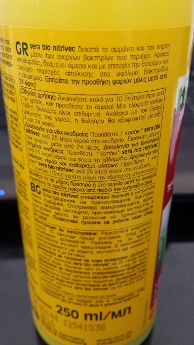 Το Σάββατο γέμισα ενυδρείο 180L αποχλωριομένο και έβαλα και την κατάλληλη ποσότητα Sera Bio Nitrivec (επισυνάπτω φωτο). Και έβαλα σε λειτουργία και το φίλτρο (εξωτερικό)