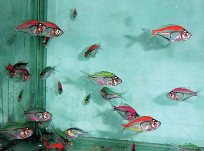 Είδε η σύζυγος κάτι glofish και ενθουσιάστηκε. Δεν το γνώριζα αλλά το υποψιάστηκα οτι δεν είναι φυσικά χρώματα για ψάρια αυτά, το διαπίστωσα εδώ. Τα μισά μαγαζιά της Θεσσαλονίκης πάντως, ίσως και παραπάνω, έχουν και glofish και danio που φωσφορίζουν σαν πινακίδες στη εθνική τη νύχτα. |