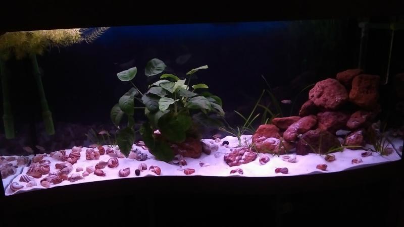 Διαστάσεις: 120x45x60 τύπου S Όγκος:320 lt Κατηγορία: Κιχλίδες Τανκανίκα Φυτά: Valisneria, Anubia gigantea και Ceratophyllum demersum Ψάρια / ¶λλα είδη: Neolamprologus similis, lamprologus ocellatus gold Διακοσμητικά υλικά: Κοχύλια και Πέτρες (χαλίκι, ξύλα κ.λ.π.) Φόντο: σκούρο μπλε Φωτισμός: 1 λάμπα τ8 Διάρκεια φωτισμού: 8 ώρες Φιλτράρισμα: 1500 λίτρα ανά ώρα Θερμοστάτης: 300wat Λίπανση:- Παροχή CO2:- Παράμετροι: pH:7,2 Γενική σκληρότητα (GH): 15 Ανθρακική σκληρότητα (ΚΗ): 10 Αμμωνία (ΝΗ3): 0 Νιτρώδη (ΝΟ2): 0 Νιτρικά (ΝΟ3): 5 Αλλαγές νερού: 50% κάθε βδομάδα Θερμοκρασία: 24 ¶λλες πληροφορίες: Το ενυδρείο τρέχει εδώ και μια βδομάδα Φωτογραφία: |